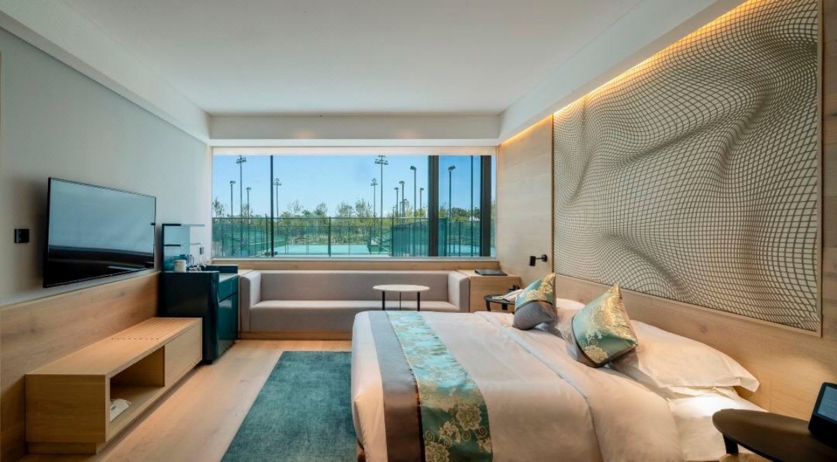 北投綠心網(wǎng)球酒店位于北京市通州區(qū)、北大運河南畔,城市綠心森林公園內(nèi)。酒店交通便捷通達(dá),距北京城市副中心三大建筑(大劇院、圖書館、博物館)5分鐘車程,距離北京市級行政中心10分鐘車程,距環(huán)球影城15分鐘車程,距首都機(jī)場39分鐘車程。為方便住客游玩,酒店還為前往環(huán)球影城的住客提供免費的往返接駁班車服務(wù)。